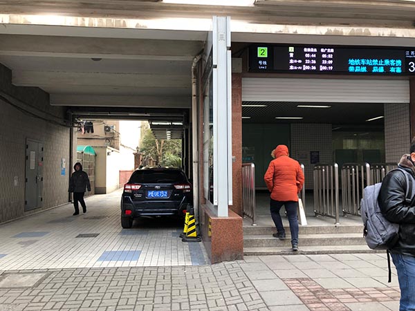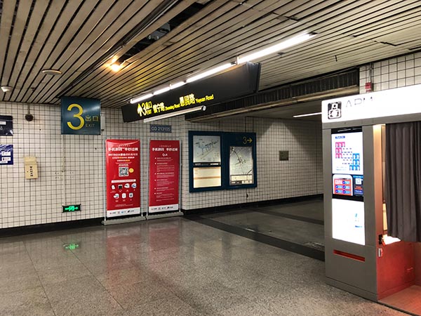 Die Fahrt mit der Metro vom Flughafen ins Stadtzentrum ist ebenfalls möglich. Vorher ist es aber noch geboten, eine Metrofahrkarte zu kaufen, entweder als Einzelfahrschein oder als Guthabenkarte. Letzteres ist das einzig Vernünftige, am besten bei der Gelegenheit die Karte gleich mal mit 100 RMB aufladen. Das sollte für einen Urlaub reichen. Jeder Mitreisende braucht seine eigene Karte. Die Mädels am Schalter sind im Zweifel beim Erwerb behilflich. Da der Flughafen die vorletzte Station der Metrolinie 2 ist, hat man sogar gewisse Chancen, einen Sitzplatz zu ergattern. Im Berufsverkehr ist die Wahl der Metro aber definitiv eine bescheidene Option, da diese Linie die am besten gefüllte in der ganzen Stadt ist. Sollte man einen Sitzplatz ergattert haben, endet die Freude darüber an der Station Guanglan Rd. Denn dort muss man von der Linie 2 in die Linie 2 umsteigen – tatsächlich, kein Scheiß. Warum das so ist, kann ich auch nicht sagen, ist aber so… Also einfach, wenn alle aussteigen, raus aus dem Zug, andere Bahnsteigseite und wieder rein in den Zug, oder in den Nächsten, sollte der Erste schon voll sein. Hat man es nach einer Ewigkeit bis zur Jiangsu Rd. geschafft, gilt es auszusteigen. Jede Station hat nummerierte Ausgänge. Bitte Ausgang Nummer 3 verwenden. Sobald ihr das Tageslicht seht, ganz ganz scharf rechts halten – also quasi einen U-Turn um 180 Grad machen – und durch die „Hofeinfahrt gehen“. Nicht wundern, einfach weitergehen. Die schmale hohle Gasse macht dann noch einen 90-Grad-Knick nach rechts und einen weiteren nach links und schon nach nur ca. 200 m steht ihr auf einer Parallelstraße zur ursprünglichen Straße. 50 m links die Straße entlang, dann die Straße überqueren und schon seid ihr an meinem Domizil angekommen.